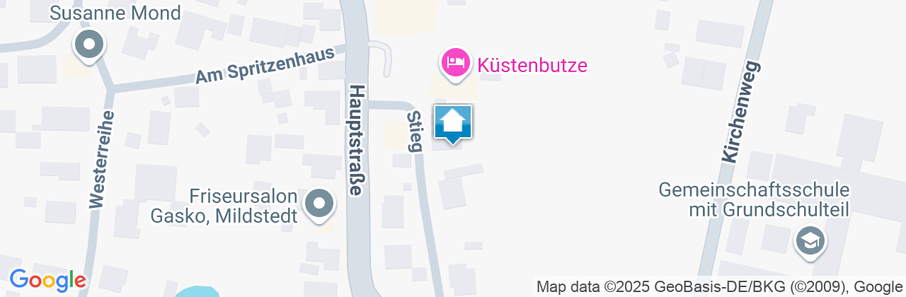Die Küstenbutze 1 erreichen Sie mit dem HusumBus – Linien 5 und 7 ab dem zentralen Busbahnhof (ZOB). Die nächste Bushaltestelle "Mildstedt, Turnhalle" befindet sich ca. 350 m von der Unterkunft entfernt.